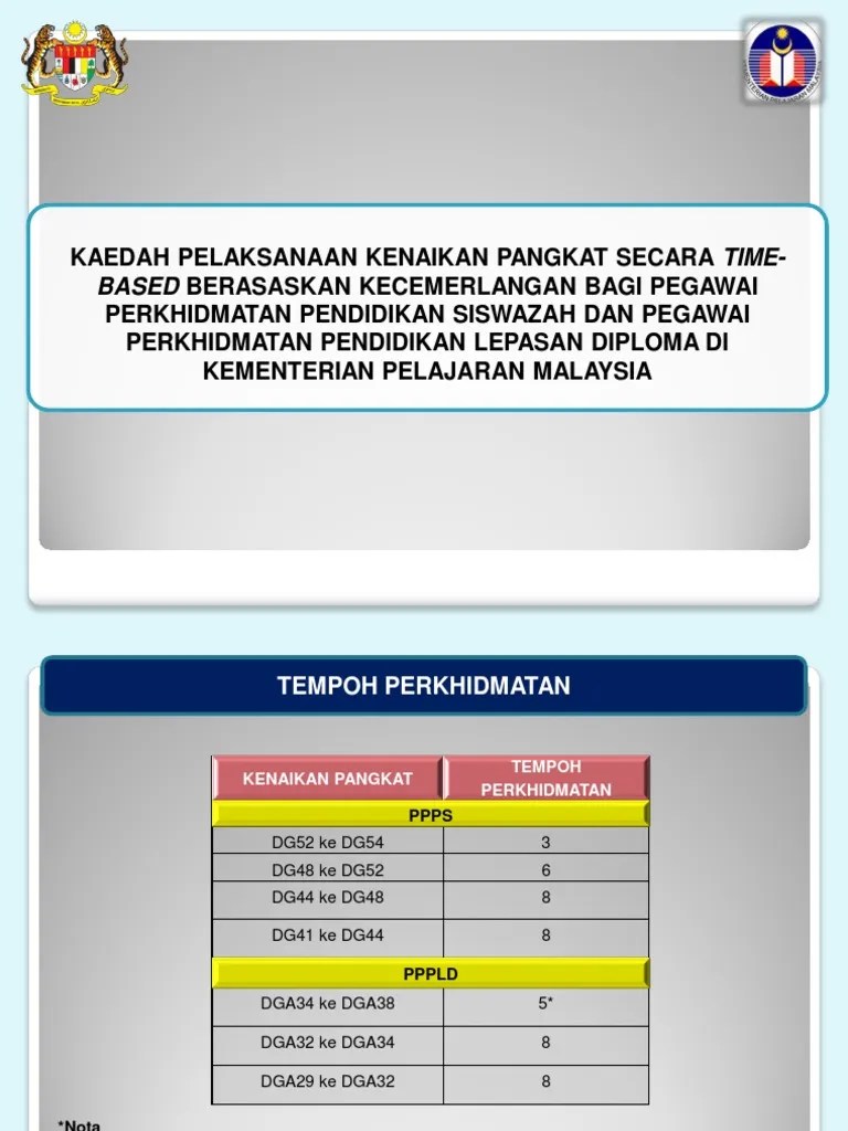 K/p jawatan tarikh dilantik gaji untuk menetapkan gaji permulaan : Rm2638.00 + kgt dg41 (rm225.00) = rm2863.00 (diberi pergerakan gaji dahulu pada 01 julai) 01 ogos 2017 naik pangkat / naik gred ke dg44 Pegawai perkhidmatan pendidikan gred dg41 atau dg42 adalah layak dipertimbangkan bagi kenaikan pangkat ke jawatan pegawai. Kaedah pelarasan kenaikan pangkat nama no. 7 latar belakang tempoh perkhidmatan bagi kenaikan pangkat secara tbbk adalah . Ini adalah indikator yang sangat ketara yang.